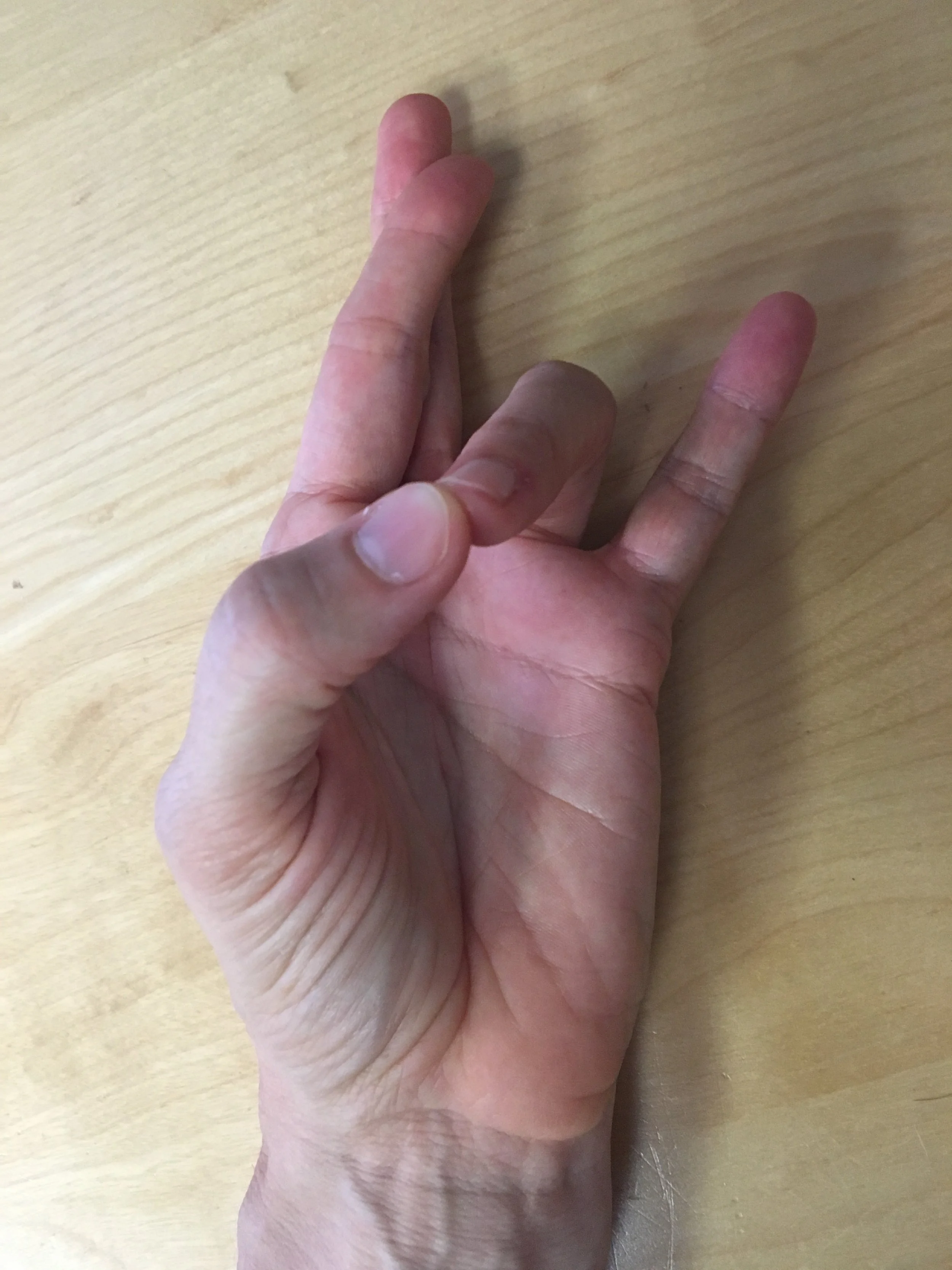 Touch the tip of the thumbs to the tips of the ring finger on the same hand